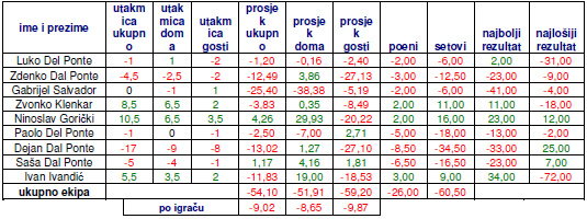 Iz ove tablice se najbolje vide razlozi ovako lošeg plasmana ove sezone. 11 mjesto i ispadanje iz lige je potpuno opravdano kada se pogleda da nam je ekipni prosjek srušenih čunjeva u odnosu na prošlu sezonu manji za čak 54,10 čunjeva. Največi problem ove sezone, uz već prije spominjanu činjenicu da ne treniramo na kuglani u Novskoj gdje igramo domaće utakmice, je neigranje Dejana (17 utakmica manje nego prošle sezone). Uz to večina igrača je smanjila prosjeke i to neki za čak 30 čunjeva i više. Najmanje oscilacije je imao Paolo, koji je čak popravio igru u gostima i Zvonko te naravno Ninoslav koji je odigrao sasvim solidno s obzirom na iskustvo. Jedini koji se popravio je Saša ali za samo 1,17 čunjeva uz 5 utakmica manje nego prošle sezone.